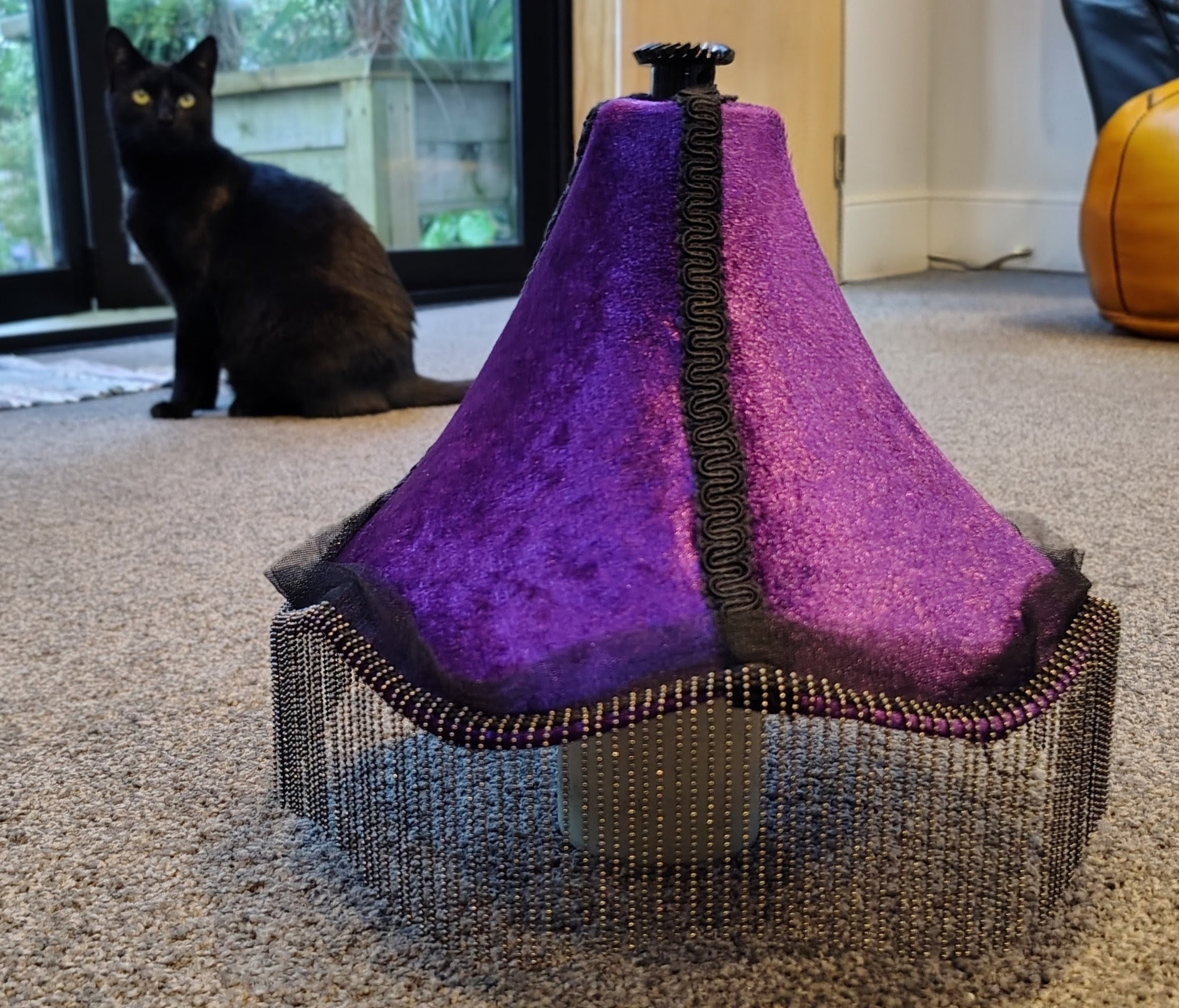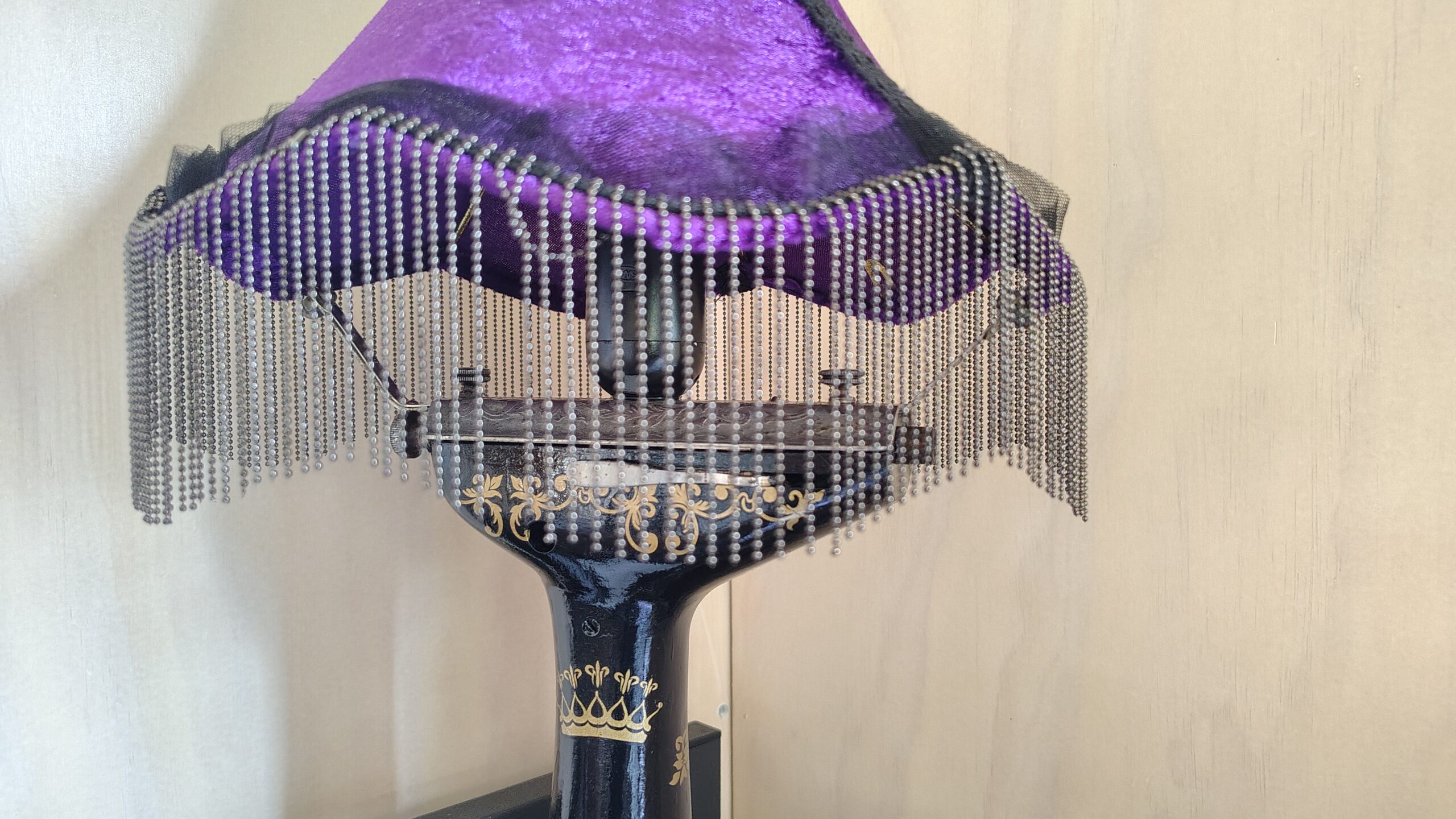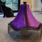 The lamp shade started life as an end of life wrecked shade rescued from an op shop. We hand sewed the velvet to the frame with lace and a metal trim to give it the finish we wanted.