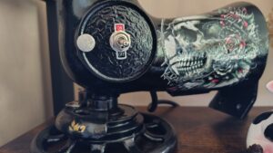 Aesthetically antique Singer sewing machines are interesting pieces of art in themselves, but if not used as a sewing machine serve no purpose and tend to sit around gathering dust. . Traceys design for Phoenix as a compact simple bedside table inspired the concept for Falling in Reverse (named after one of Gavins favourite bands). We decided to use a slightly gothic theme in the art work and design for this one – just because thats different.