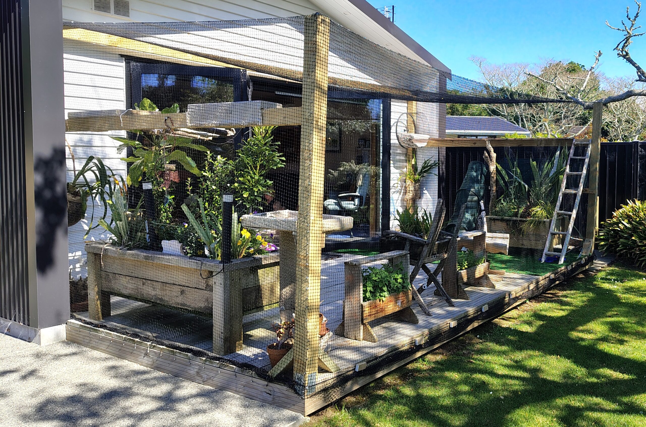 The end result thanks to The Junction, New Plymouths waste recycling store, and random junk we found on our travels. Our only new purchases for the catio build – the netting from Catio NZ that is specifically designed for catios, and advice plus plants from Big Jims Garden Centre for the planter boxes.