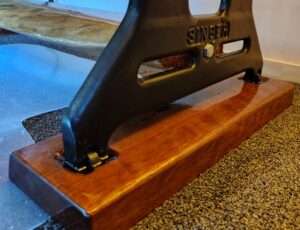 Nova started life as a naturally dried slab of Macrocarpa wood. The idea came around from the slab and wanting to use some leftover industrial Singer sewing machine cabinet legs to fashion a desk / workstation.