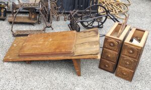 It started with a total strip down of everything to the smallest possible components. The wood prep was a total sand by hand starting with 80 grit and working down to 180, with any damaged laminate simply smoothed out at the edges as opposed to trying to repair and replace. Not wanting a large imposing end product we cut down the drawers to a single drawer for each side and only used the main lid cover from the original cabinet to give a narrower profile. The wooden decals detracted from the clean look we wanted so off they came to give the wood grain underneath better visibility. We used the same redwood stain we had used on Genesis, producing a different outcome possibly from the difference in origin of the timber. Again we finished with several coats of clear gloss acrylic varnish.