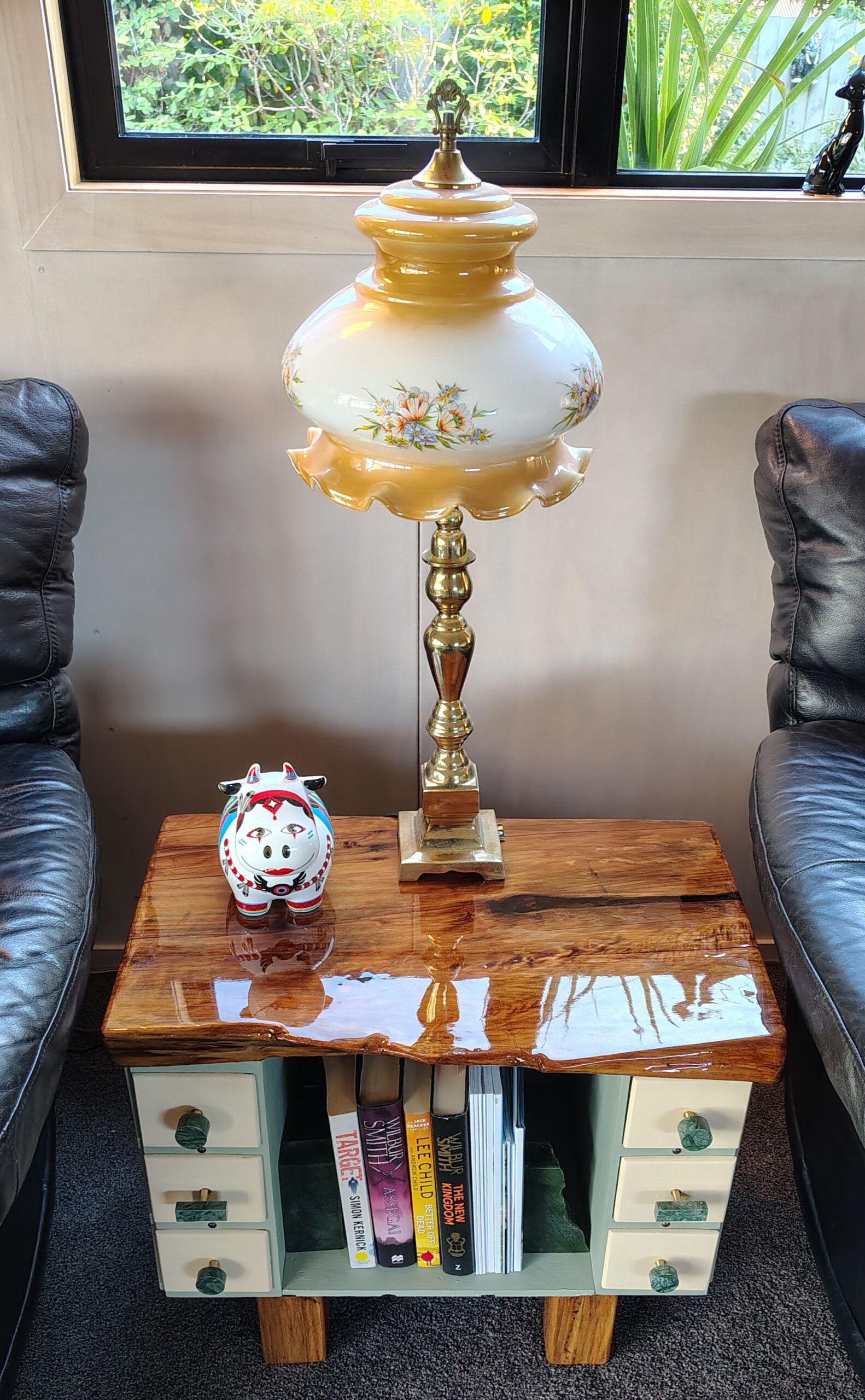 Reliquilae is the remains from several different Singer sewing machine cabinets, circa 1920's and 1930's. Seemed a waste to not use the beautiful wood and components for something so hence the creation. The legs and top slab are raw natural dried Macracarpa.