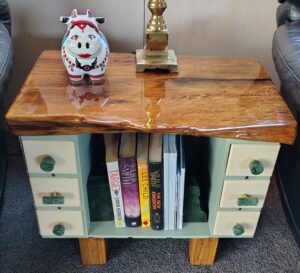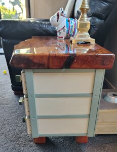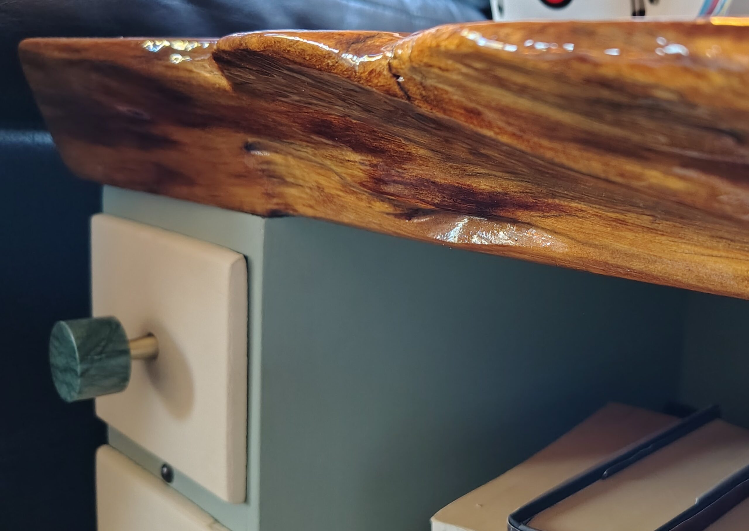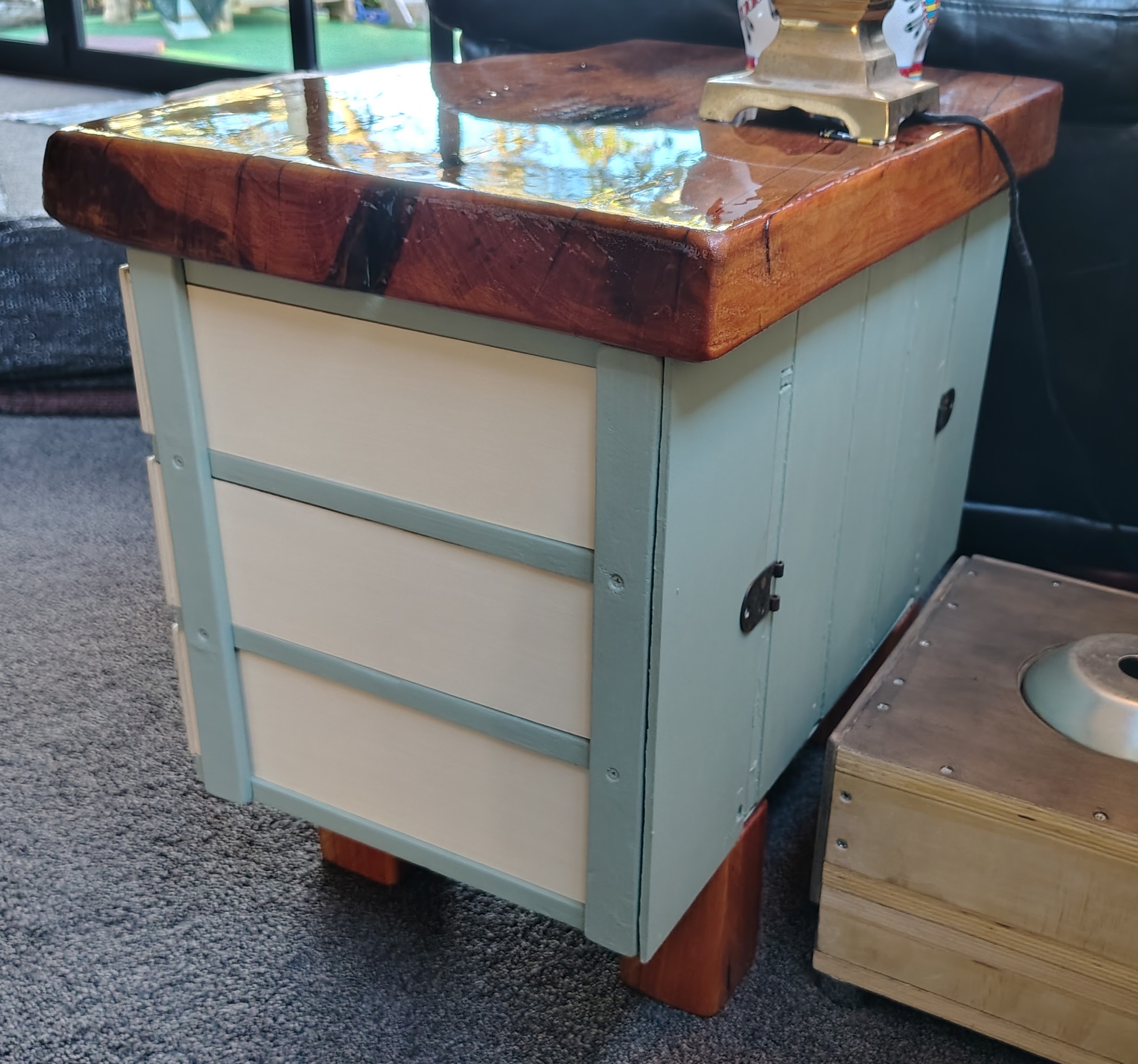 Relatively simple, we took the spares and played jigsaw to see what the most feasible combination was. Tracey opted for country style colours again. A Dairy Cream off white and Sage green. The feet and top slabs natural grains and colours enhanced by a heavy coating of epoxy resin. The handles are a jade material with brass plated attachments.