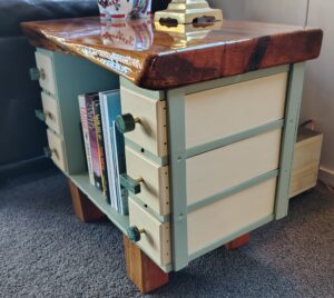 Reliquilae is Latin for left overs or the remains. Like Asher, Reliquilae is the remains of several different Singer sewing machine cabinets. The standout feature is a naturally dried slab of macrocarpa used for the top and legs.