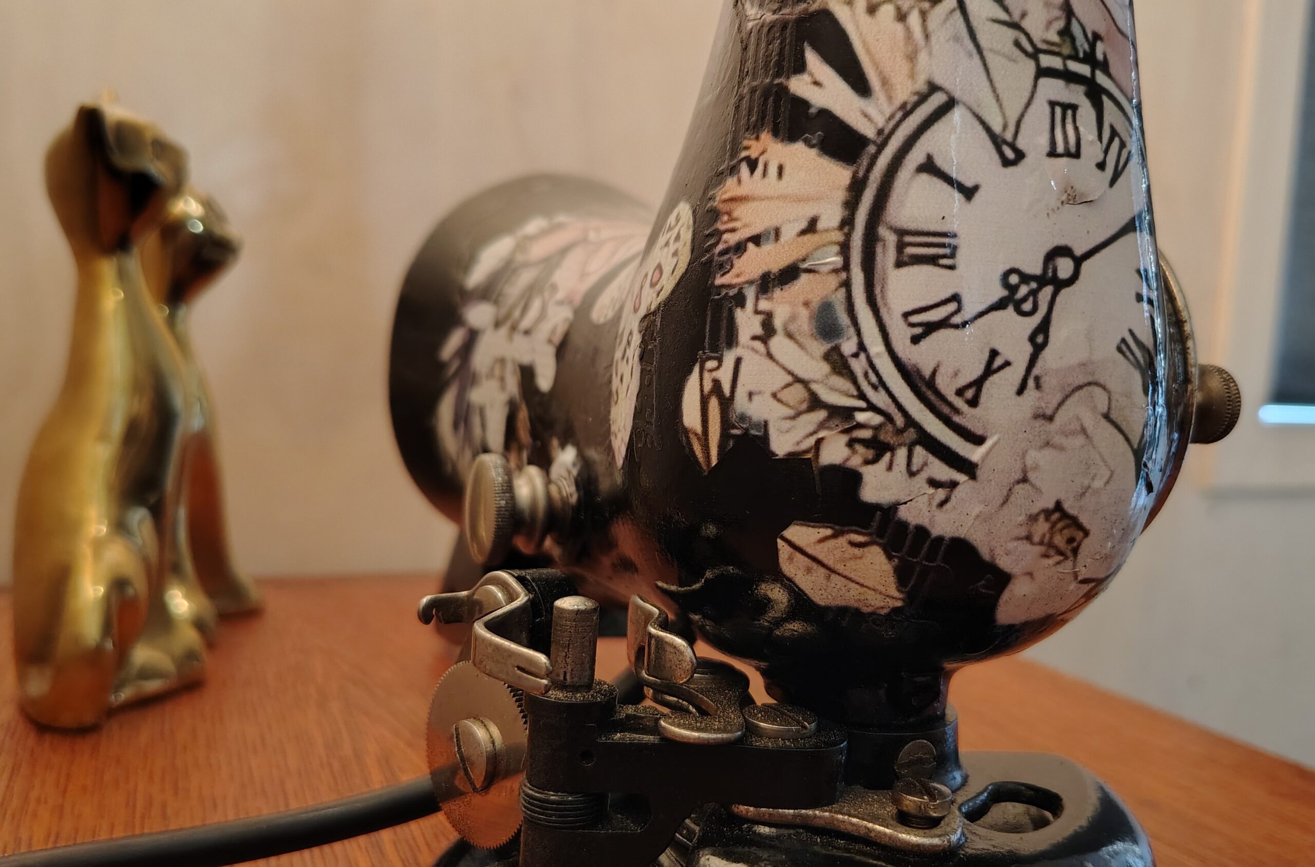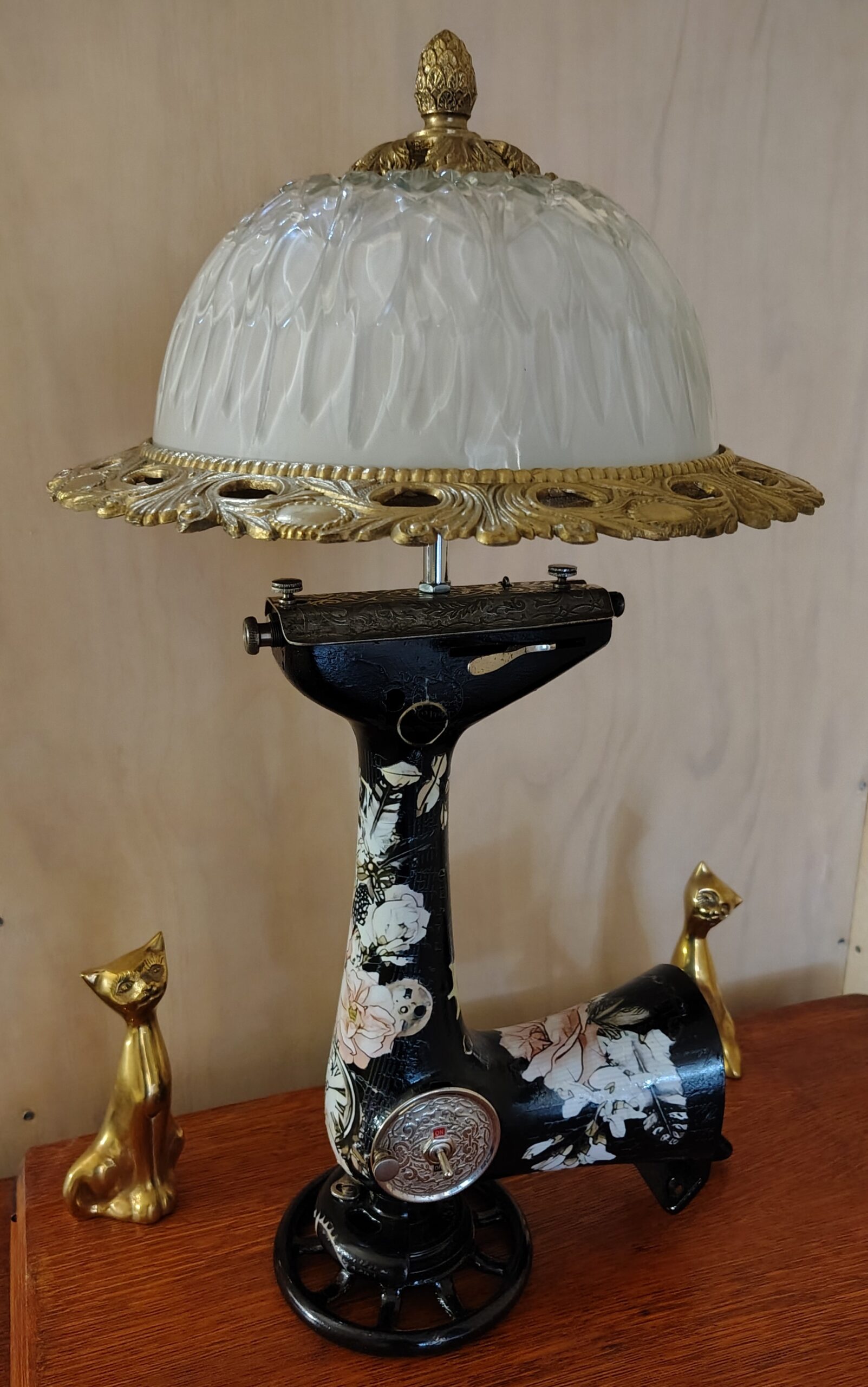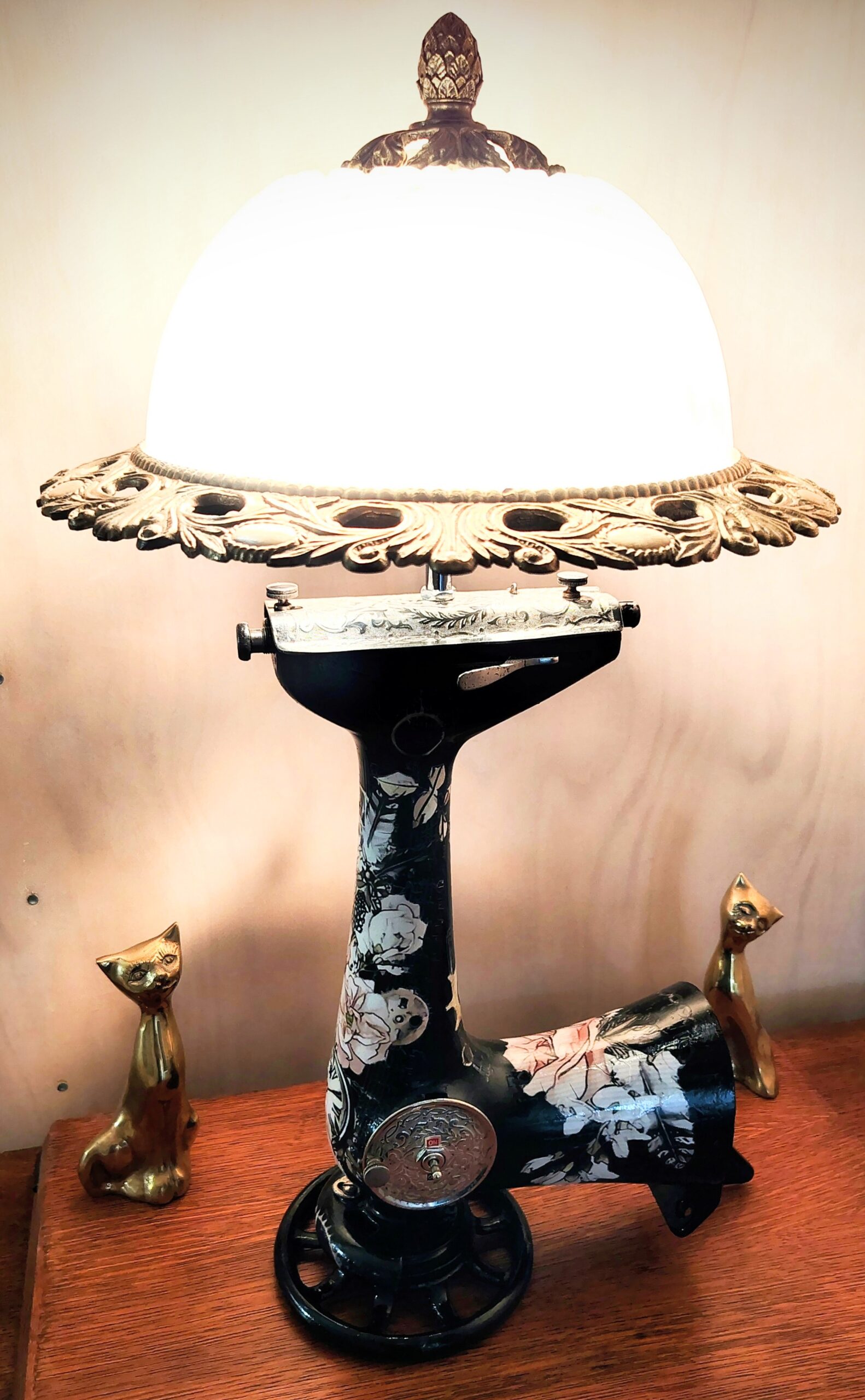 The shade needed stripping with the brass requiring scrubbing with a brass wire brush, then brasso. I had to modify the attachments as we intended to mount the unit inversely to how to was designed for use. Quick order off TEMU and we had the threaded hollow tube and short fixtures to mount the shade on the main body of the lamp.