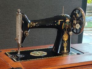 This Singer model is a heavy-duty antique cast-iron domestic sewing machine produced from 1902 through the mid-1950s and often referred to as the Model 66 "Red Eye", with peak production occurring in the 1910s and 1920s. It is known for its distinctive decals, which feature gold, red, and orange "eyes" in a pattern that resembles Lotus petals.