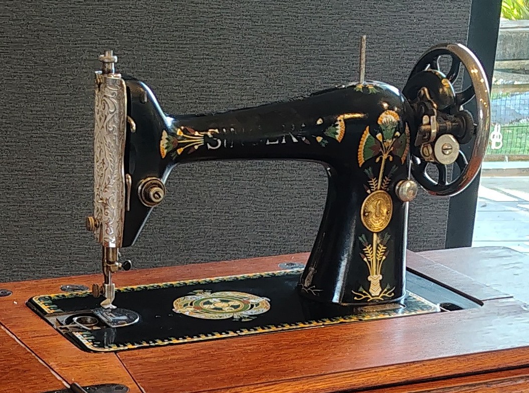 We purchased the machine and cabinet as a complete working unit years ago at an auction house in Hawera, Taranaki. It sat untouched as a bedside table at Traceys mums place . Originally the model 66K sewing machine, serial Y7574386, was 1 of 130,000 made at the Singer Elizabethport New Jersey USA factory (1873 -1982) in 1922.
